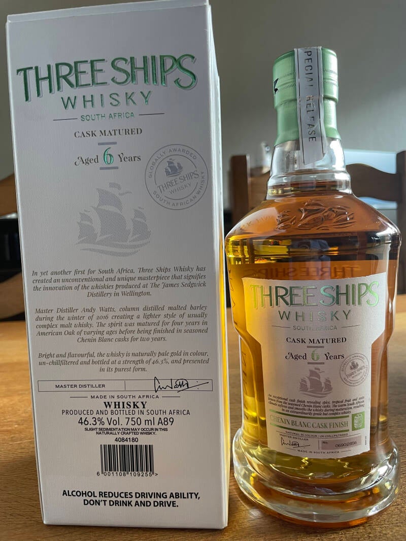 De Three Ships 6 years old Chenin Blanc cask finish single malt whisky, niet verkrijgbaar in Europa